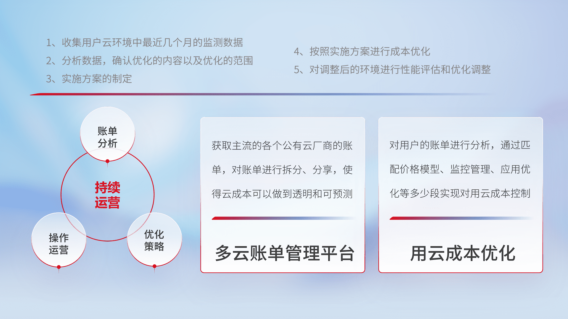 通过多云纳管,,,,以统一的资源数据模型把客户的云资源进行抽象和封装,,进而实现对多云资源的统一操作,,,保障云资源管理的可靠性、、稳定性与可用性。。量身定制化运维内容,,,配置、、、开发运维、、、补丁管理、、、备份、、、、监控、、、认证和访问管理、、、审计和日常巡检等,,,保障在用云过程中的可靠度,,稳定度以及高可用率。。。