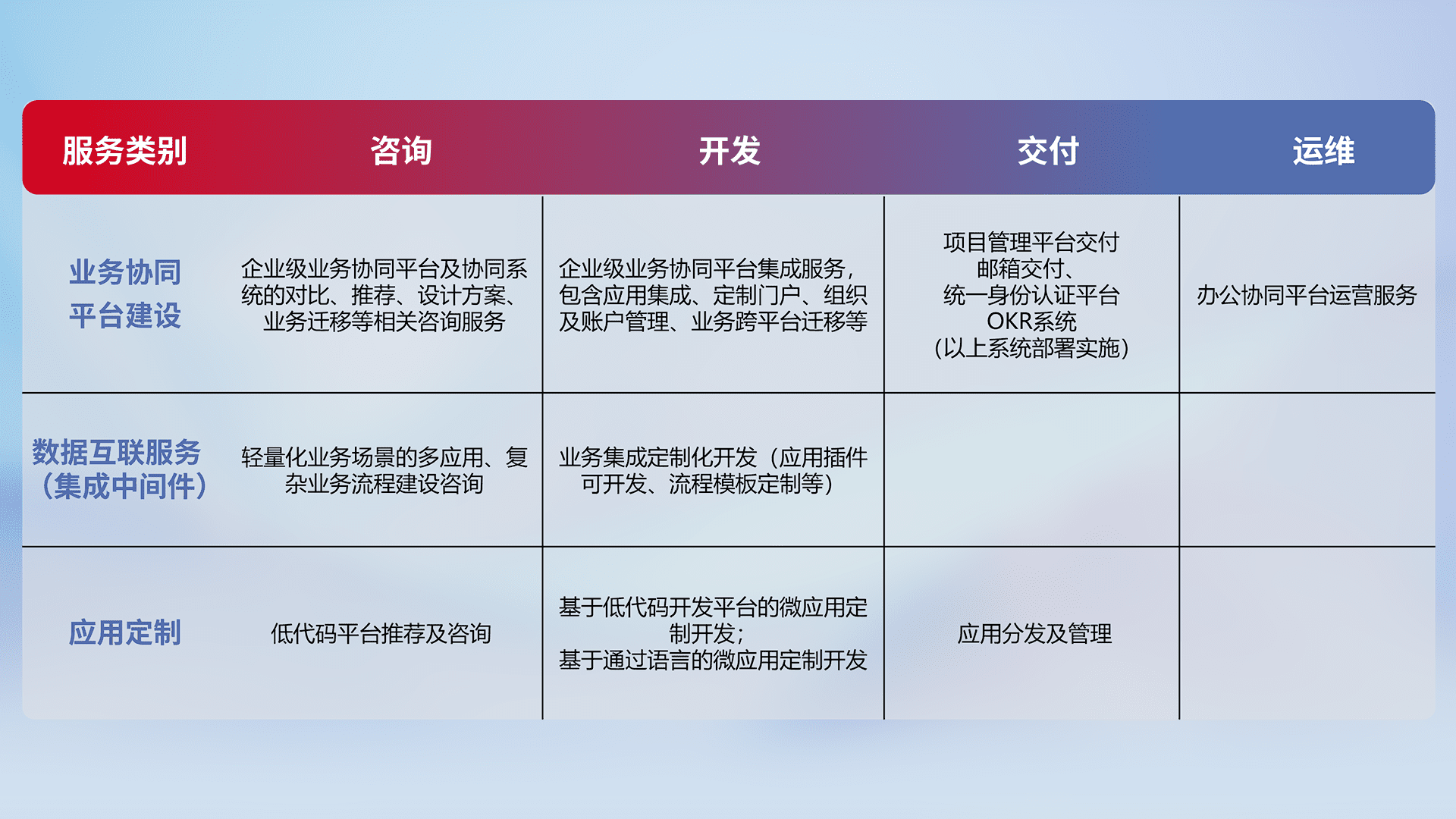 针对钉钉、、、企微、、、IDaas等平台级产品提供产品的规划、、、方案、、交付、、定制化开发等服务,,实现如统一协同办公、、、智能客户服务、、、、混合会议管理、、、、智能数据查询、、、等业务场景,,实现数字化转型。。